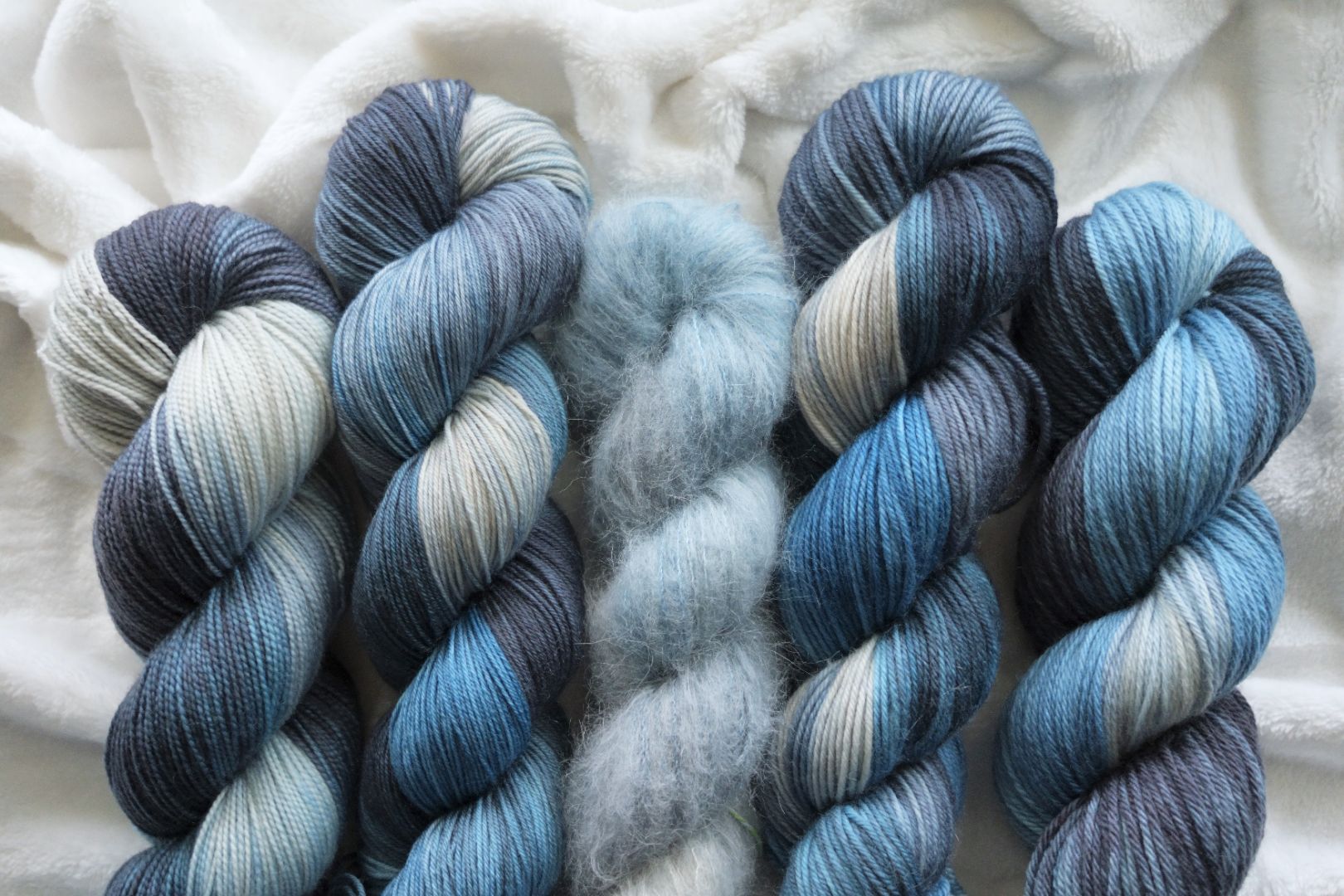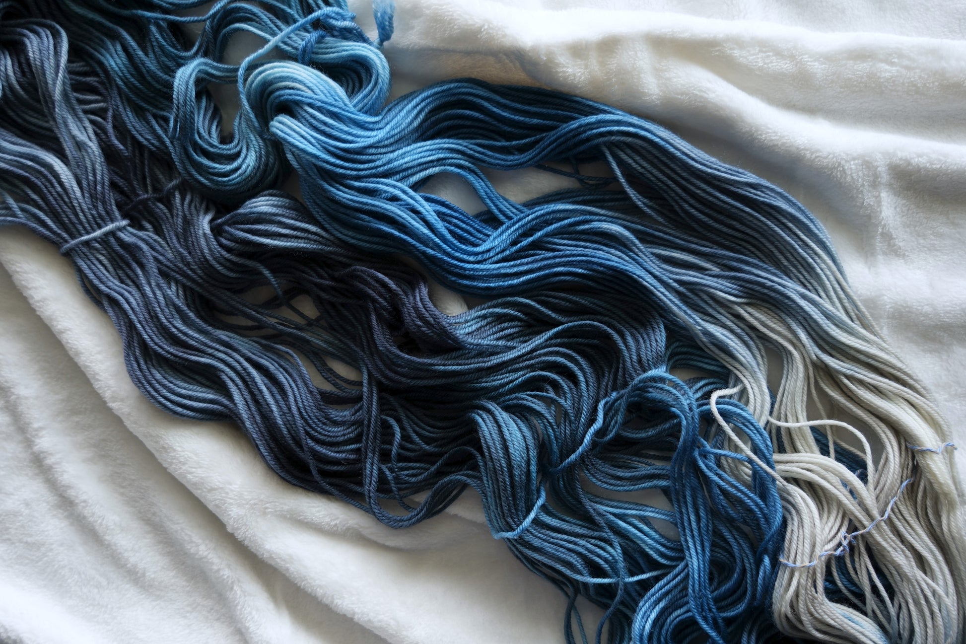 Our Shadow and Bone colorway is a fade from deep navy, to cloudy blue, to ice blue, and then pale grey.